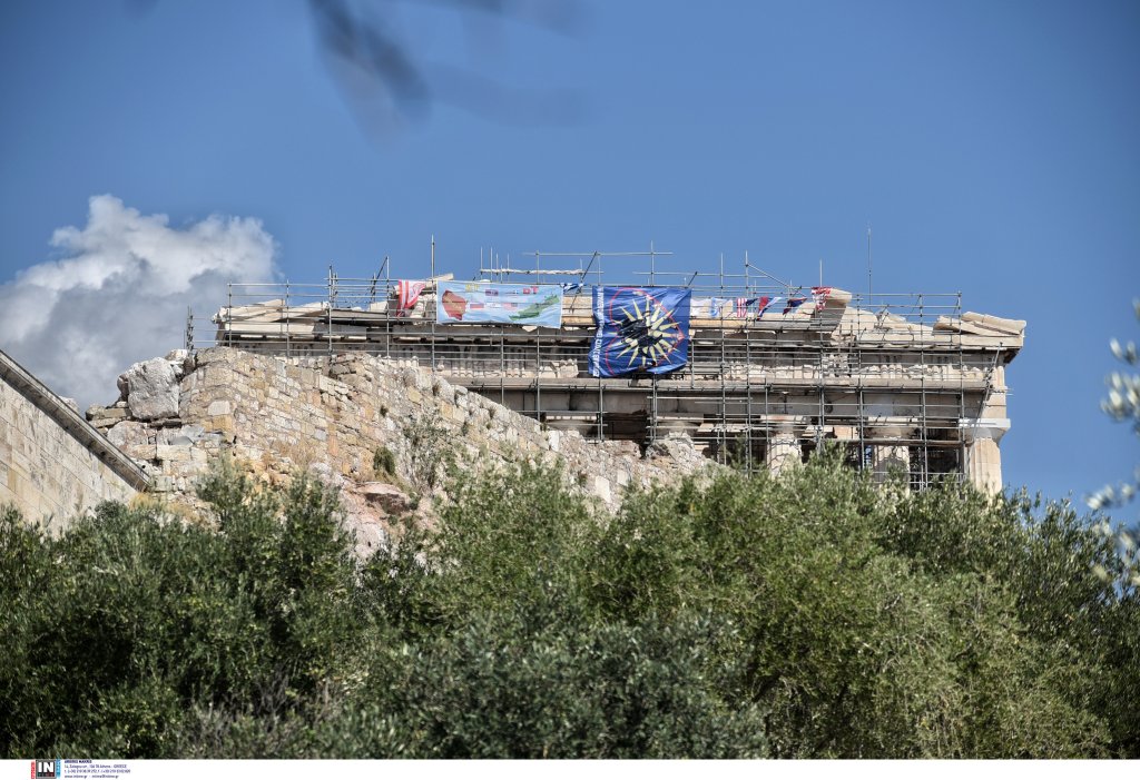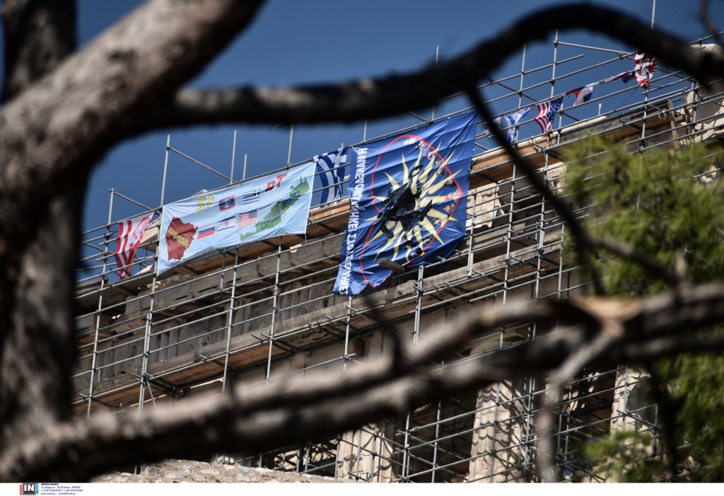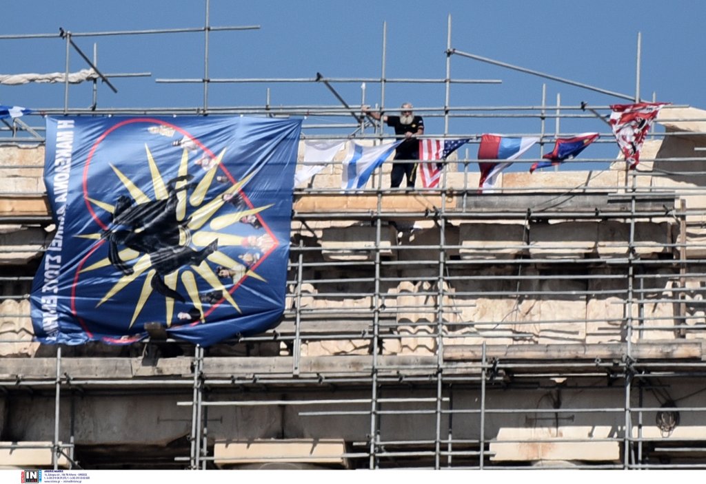 Σκαρφαλωμένος στις σκαλωσιές του Παρθενώνα βρίσκεται ένας άνδρας, ο οποίος περίπου στις 12 το μεσημέρι της Κυριακής διέφυγε της προσοχής των φυλάκων και ανέβηκε στον Παρθενώνα όπου κρέμασε σημαίες του Ισραήλ, της Ελλάδας, της Νέας Δημοκρατίας αλλά και το αστέρι της Βεργίνας.
