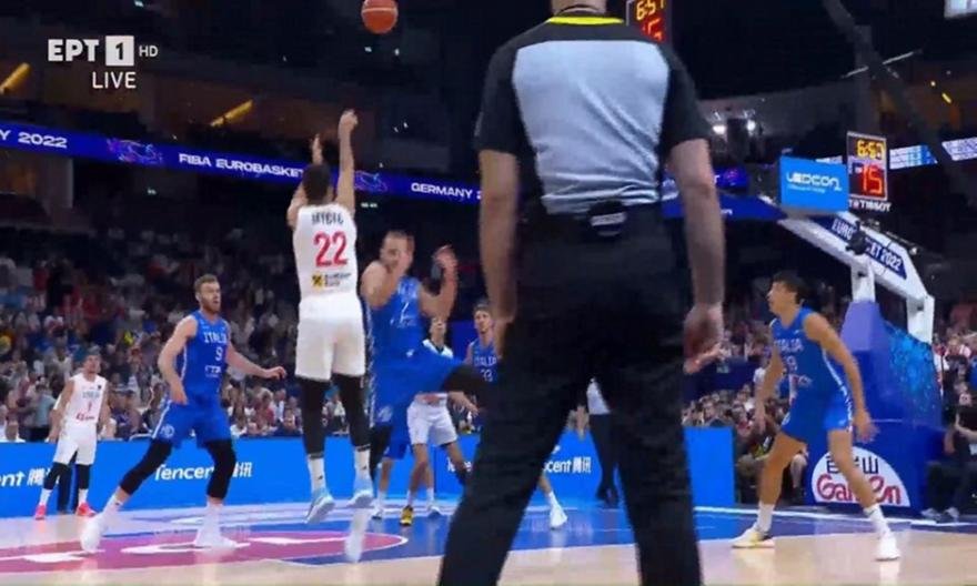Εντυπωσιακή φάση από τον Βασίλιε Μίτσιτς κατά τη διάρκεια του αγώνα Σερβία-Ιταλία, με τον γκαρντ να ευστοχεί σε σουτ δύο πόντων και να κερδίζει και το φάουλ.