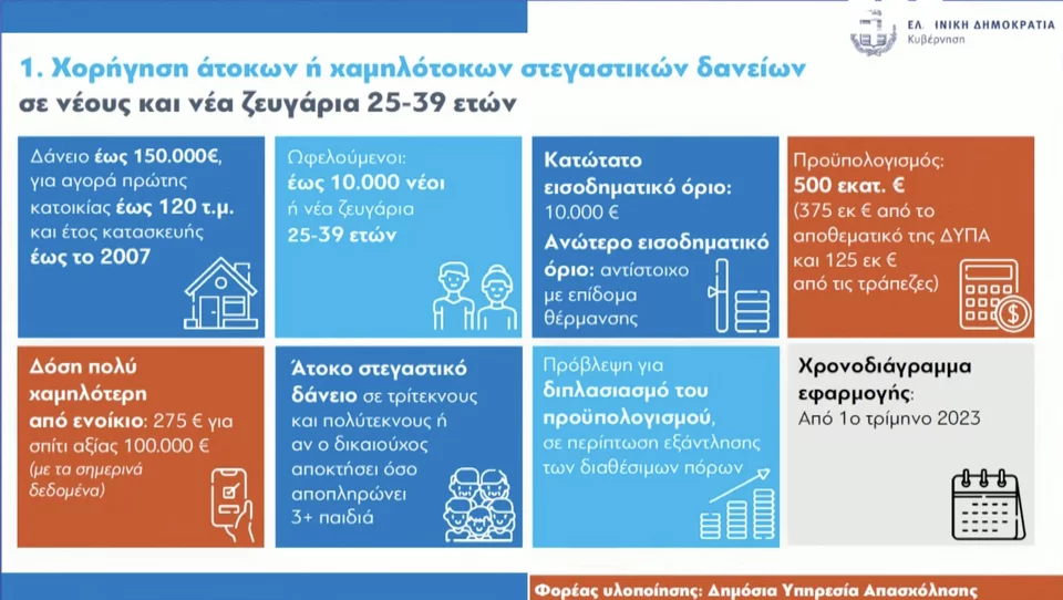 - Χορήγηση άτοκων ή χαμηλότοκων στεγαστικών δανείων για αγορά πρώτης κατοικίας από νέους και νέα ζευγάρια 25-39 ετών.
