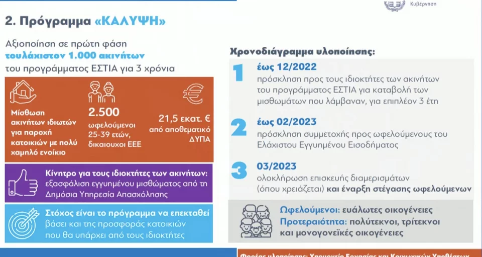 - Έως 12/2022 πρόσκληση προς τους ιδιοκτήτες των ακινήτων του προγράμματος ΕΣΤΙΑ για καταβολή των μισθωμάτων που λάμβαναν, για επιπλέον τρία έτη