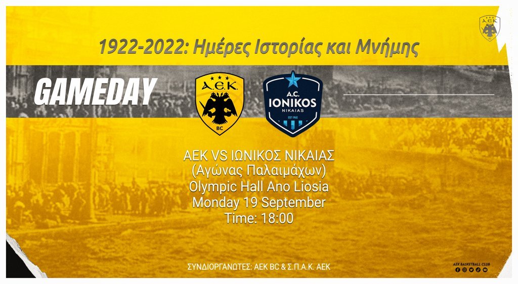 Στο πλαίσιο των δράσεων «1922-2022: Ημέρες Ιστορίας και Μνήμης», που διοργανώνει η ΑΕΚ BC, με τη καθοριστική συμβολή των Φίλων Καλαθοσφαίρισης ΑΕΚ και τον ΣΠΑΚ – ΑΕΚ, υπενθυμίζουμε, ότι ακολουθεί τη Δευτέρα 19 Σεπτεμβρίου, ώρα 18:00, στο Olympic Hall των Άνω Λιοσίων, το νέο αντάμωμα με την Ιστορία.