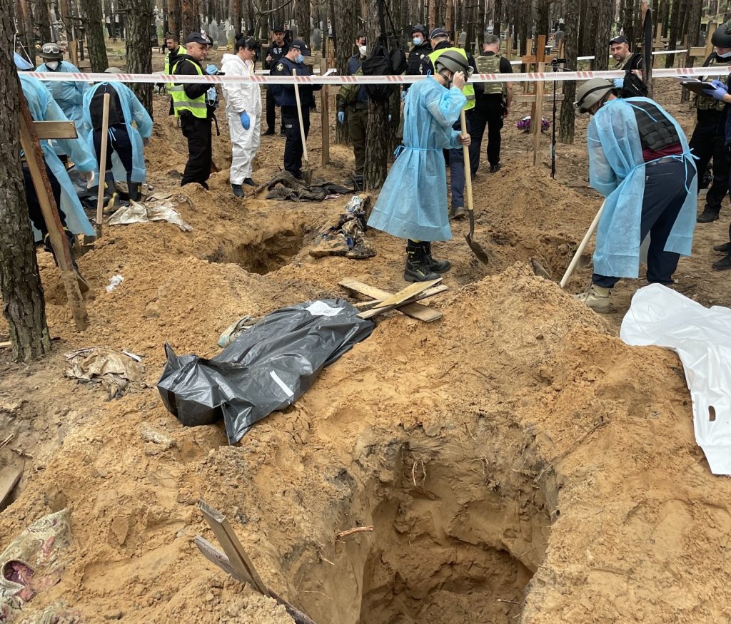 Horrific scenes in Izyum today. Some 445 people buried in this forest, all of whom died during six-month Russian occupation of the city. Another 17 Ukrainian soldiers were executed and dumped together in a single pit. Prosecutors say there’s evidence the soldiers were tortured pic.twitter.com/EgmH6lPnqb