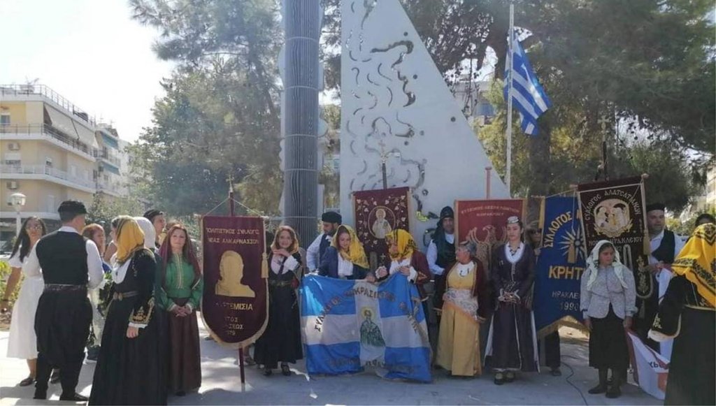 Στη συνέχεια με πομπή από τον Άγιο Μηνά όλοι πήραν τον δρόμο για το μνημείο στη συμβολή Κνωσού και Ιωνίας όπου μικροί και μεγάλοι, δεύτερες, τρίτες, τέταρτες ακόμα και πέμπτες γενιές Μικρασιατών κοίταξαν τον ουρανό για να «δουν» αυτούς που έφτιαξαν πριν ένα αιώνα μια νέα Ελλάδα, με τον «πηλό» του ανυπέρβητου πολιτισμού που είχαν δημιουργήσει σε μια γη αλησμόνητη και ελληνική από τα χρόνια των αρχαίων σοφών.
