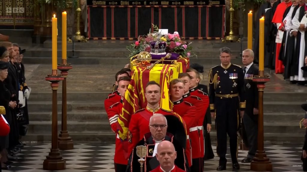 Στις 14.00 (ώρα Ελλάδας) ολοκληρώθηκε η πολιτική νεκρώσιμη ακολουθία (θα ακολουθήσει και πιο προσωπική μόνο με τα μέλη της βασιλικής οικογένειας)για την βασίλισσα Ελισάβετ στο Αββαείο του Γουέστμινστερ. Στις 13:57 ώρα Ελλάδος (τοπική ώρα 11:57) κηρύχθηκε δύο λεπτών σιγή σε όλο το Ηνωμένο Βασίλειο, ενώ ακολούθησε ο εθνικός ύμνος «God save the King». Στη συνέχεια σειρά έχει η πομπή προς την Αψίδα του Ουέλινγκτον.