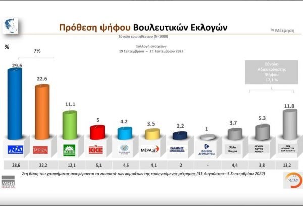 Δημοσκόπηση της εταιρείας MRB παρουσίασε ο τηλεοπτικός σταθμός OPEN. Αναφορικά τώρα με την πρόθεση ψήφου, η Νέα Δημοκρατία καταγράφει ποσοστό 29,6% έναντι 22,6% του ΣΥΡΙΖΑ ενώ το ΠΑΣΟΚ καταγράφει ποσοστό 12,1%. Τέταρτο το ΚΚΕ με 5,1% και ακολουθεί η Ελληνική Λύση και το Μέρα25 με 4,2% και 3,5% αντίστοιχα. Με αναγωγή στα έγκυρα (χωρίς την αποχή και τα λευκά) τα ποσοστά των κομμάτων διαμορφώνονται ως εξής: Νέα Δημοκρατία 31,3%, ΣΥΡΙΖΑ 23,8%, ΠΑΣΟΚ 11,7%, ΚΚΕ 5,#, Ελληνική Λύση 4,4 και Μέρα25 3,7%.
