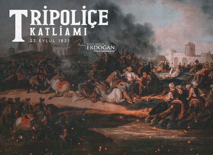 Σε ανάρτηση για την Τριπολιτσά προχώρησε ο Ρετζέπ Ταγίπ Ερντογάν. «Δεν θα ξεχάσουμε ποτέ τη Σφαγή της Τριπολιτσάς που έγινε στις 23 Σεπτεμβρίου του 1821», έγραψε.