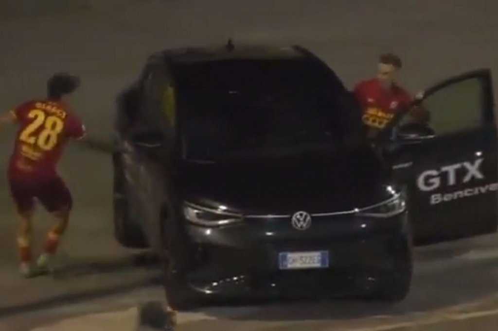 Αφού μπήκε μέσα στο αμάξι πάτησε κόρνες, άναψε τα φώτα, με τους συμπαίκτες του να τον ακολουθούν πανηγυρίζοντας.