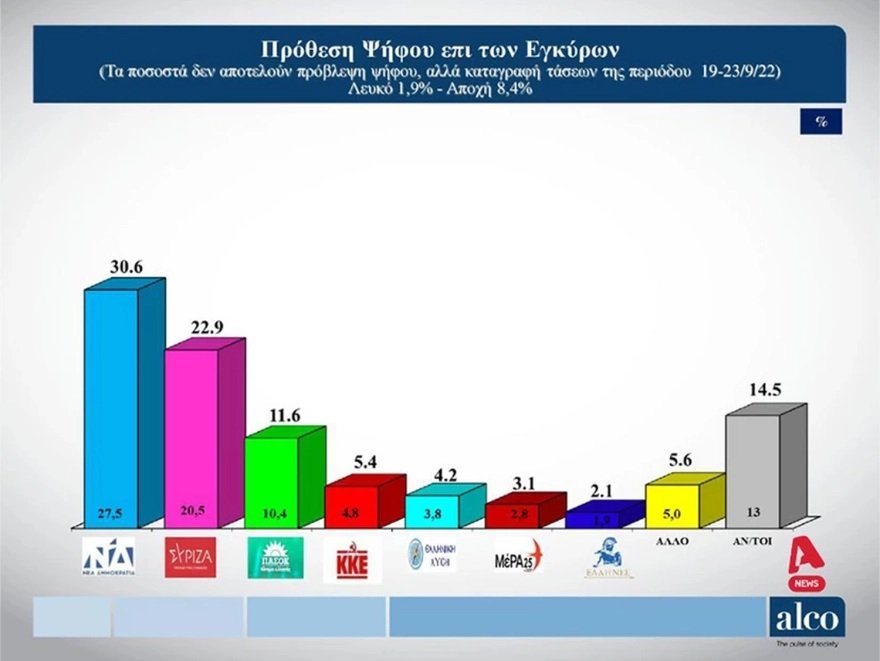 Προβάδισμα 7,7 ποσοστιαίων μονάδων διατηρεί η ΝΔ έναντι του ΣΥΡΙΖΑ σε δημοσκόπηση της εταιρείας ALCO, που παρουσιάστηκε στο κεντρικό δελτίο ειδήσεων του Alpha.
