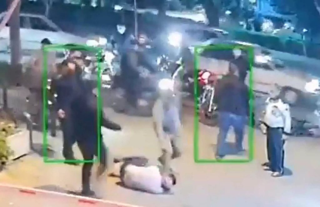 Αμέσως τον χτυπούν και τον πετούν κάτω 3 άτομα, και συνεχίζουν να τον κλωτσούν σε σώμα και κεφάλι.