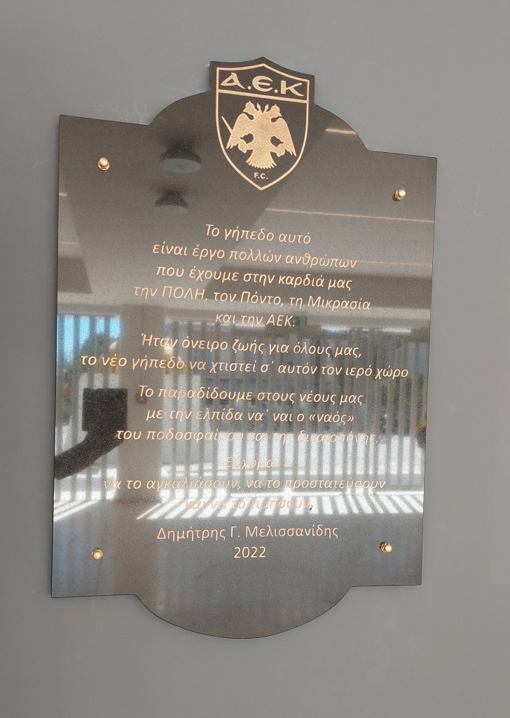 Το μήνυμα του Δημήτρη Μελισσανίδη μας υποδέχεται πλέον στην είσοδο του γηπέδου. Σε μια πλακέτα ο διοικητικός ηγέτης της ΑΕΚ μοιράζεται μαζί μας τις σκέψεις και τις ευχές του για τον Ναό.