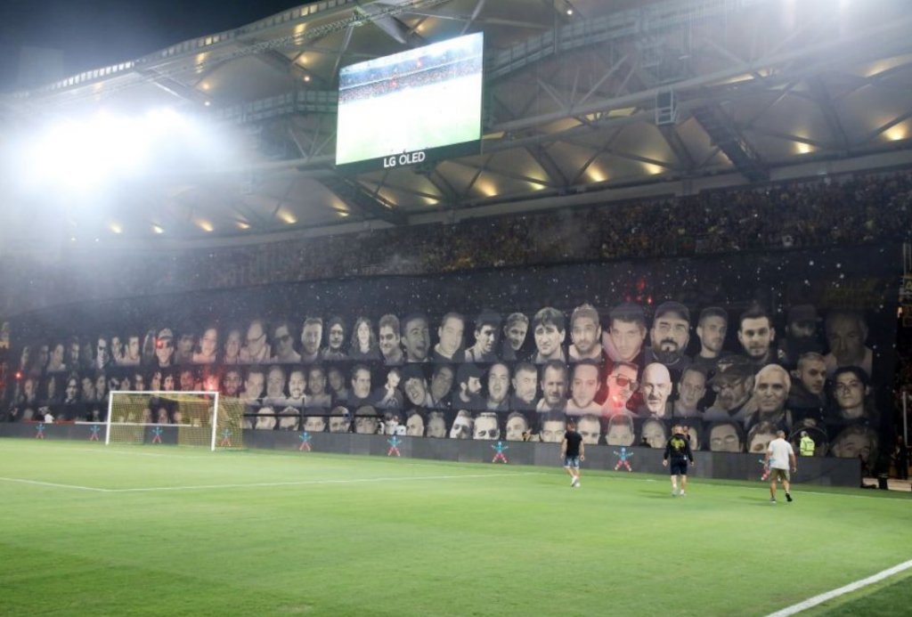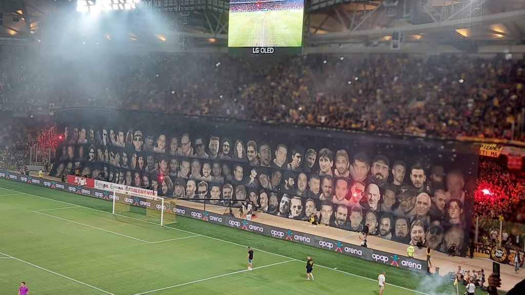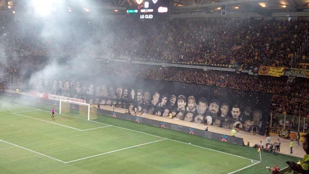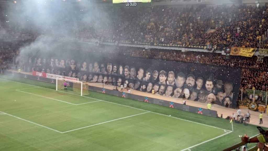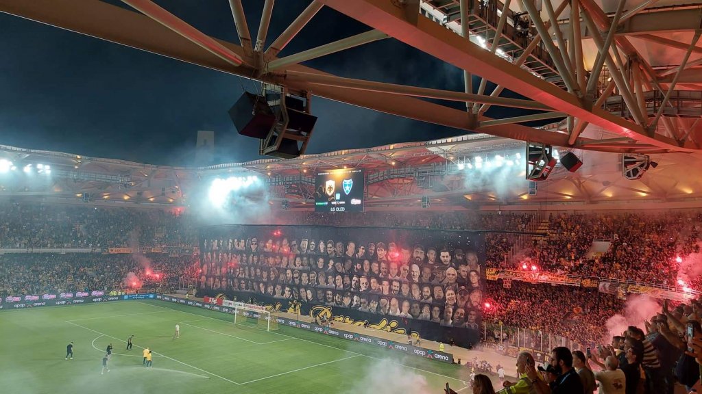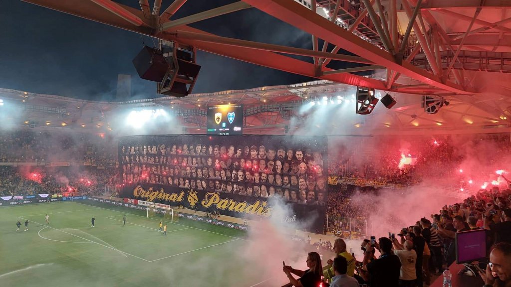 Ανατριχίλα!!! Οι κερκίδες της Αγίας Σοφίας πήραν... φωτιά στην ανάκρουση του ύμνου , ενώ ένα τρομερό πανό με την Original Παραδείσου είχαν οι φίλοι της ΑΕΚ στο πρώτο ματς της Ένωσης στην OPAP Arena, όπου απεικόνιζε όσους «έφυγαν» δεν πρόλαβαν να δουν το νέο σπίτι της ΑΕΚ.