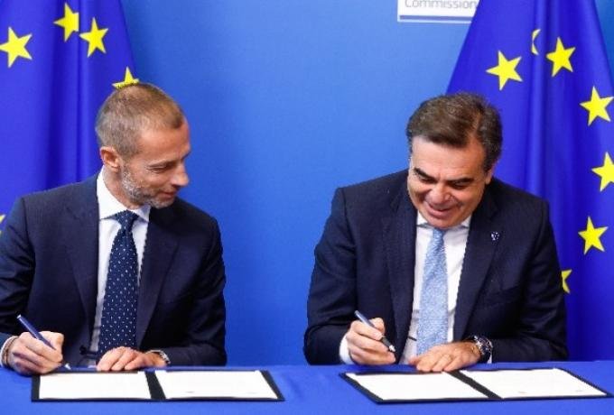 O αντιπρόεδρος της Κομισιόν Μαργαρίτης Σχοινάς και ο πρόεδρος της UEFA Αλεξάντερ Τσεφερίν υπέγραψαν στις Βρυξέλλες τη νέα συμφωνία συνεργασίας μεταξύ της Επιτροπής και της UEFA, που εγκρίθηκε τον Ιούνιο του 2022.