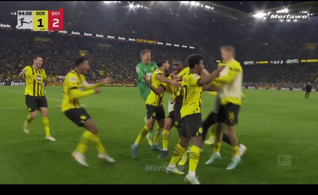 Τελικά, η καταστροφή για την Μπάγερν ήρθε μετά το 90'. Αρχικά, η πρωταθλήτρια έμεινε με δέκα παίκτες, αφού ο Κομάν δέχτηκε δεύτερη κίτρινη και αποβλήθηκε, ενώ, στο 95' ο Άντονι Μοντέστ χάρισε τον βαθμό της ισοπαλίας στη Ντόρτμουντ, κάνοντας το 2-2.