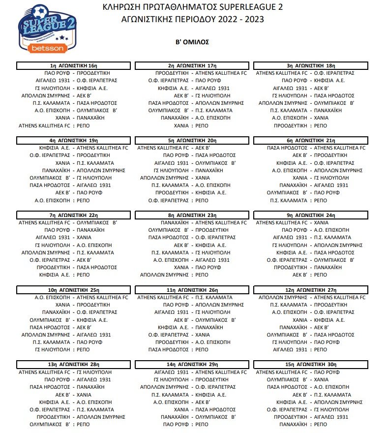 Το πρόγραμμα της ΑΕΚ Β' στη Super League 2