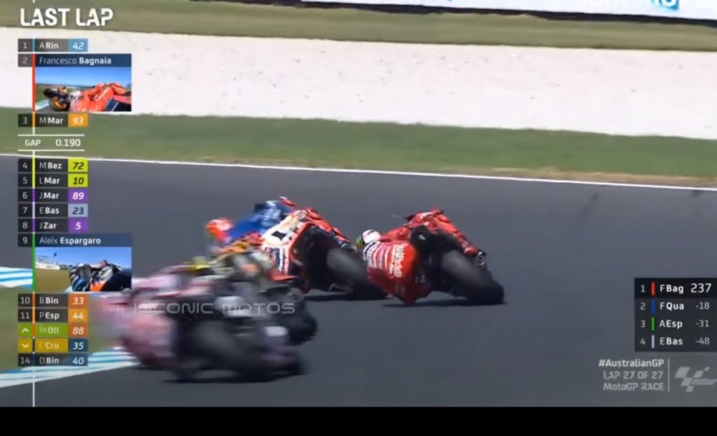 Ο 18ος αγώνας του Παγκοσμίου Πρωταθλήματος Moto GP διεξήχθη στην Αυστραλία, είχε ανατροπές, ήταν συναρπαστικός και βρήκε νικητή τον Άλεξ Ρινς. Στους κερδισμένους του αγώνα και ο, πρωτοπόρος της βαθμολογίας, Πέκο Μπανάια της Ducati, ο οποίος τερμάτισε τρίτος, αλλά εκμεταλλεύτηκε το γεγονός πως ο Φάμπιο Κουαρταραρό της Yamaha εγκατέλειψε και αύξησε τη διαφορά του στους 14 βαθμούς, φτάνοντας πιο κοντά στον τίτλο.