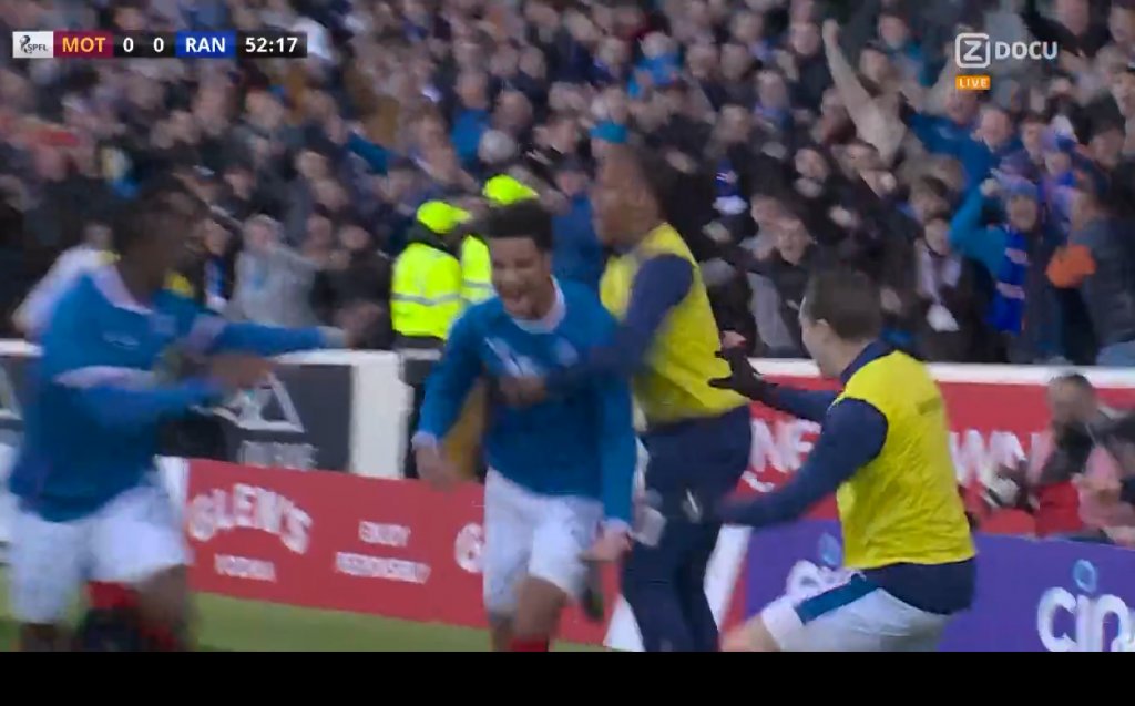 Έστω και δύσκολα, ο στόχος επετεύχθη, για την ομάδα του Τζιοβάνι Φαν Μπρόνκχορστ, η οποία επικράτησε 2-1, εκτός έδρας της Μάδεργουελ. Στο 53' ο Μαλίκ Τίλμαν πήρε την μπάλα κάτω από τη μεσαία γραμμή, ξεκίνησε την κούρσα, μάζεψε γύρω του τέσσερις αντιπάλους, δεν πτοήθηκε, μπήκε στην αντίπαλη περιοχή και πλάσαρε για το 1-0. Η Ρέιντζερς διπλασίασε τα τέρματά της, στο 69', με τον Τζον Λούντστραμ, με τη Μάδεργουελ να μειώνει, χάρη σε εκτέλεση φάουλ του Στιούαρτ ΜακΚίνστρι, στο 77ο λεπτό.