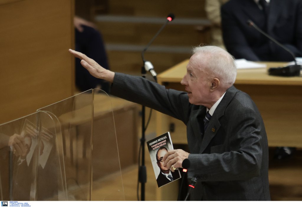 Εκτός από το φωτογραφικό υλικό ο Κωνσταντίνος Πλεύρης κρατούσε κι ένα από τα βιβλία που έχει συγγράψει για την πολιτική πορεία και το έργο του Ιωάννη Μεταξά.
