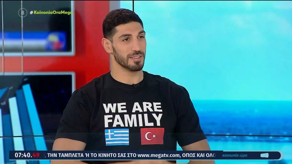 Φορώντας ένα μπλουζάκι στο οποίο απεικονίζονταν η ελληνική και η τουρκική σημαία και έγραφε «Είμαστε οικογένεια», ο Ενές Καντέρ θέλησε να στείλει το δικό του μήνυμα.