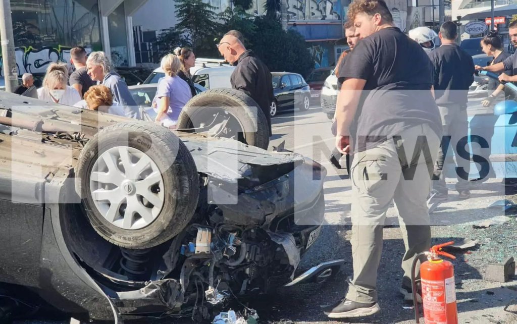 Το ένα από τα αυτοκίνητα αναποδογύρισε στη μέση του δρόμου.