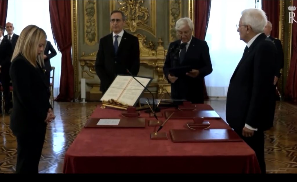 Όλοι οι υπουργοί ορκίσθηκαν ότι «θα είναι πιστοί στην αβασίλευτη Δημοκρατία, ότι θα σέβονται με αφοσίωση τους νόμους και το Σύνταγμα και ότι θα ασκήσουν τα καθήκοντά τους, προς το απόλυτο συμφέρον του έθνους». Η Μελόνι, η πρώτη γυναίκα που αναλαμβάνει την πρωθυπουργία της Ιταλίας, ήταν εμφανώς συγκινημένη ενώ για λίγα δευτερόλεπτα το στυλό γλίστρησε από τα χέρια του Ματέο Σαλβίνι, νέου υπουργού Υποδομών. Στις ιδιαιτερότητες της ημέρας και ένα μικρό «σαρδάμ» του νέου υπουργού εξωτερικών, Αντόνιο Ταγιάνι, κατά την διάρκεια της ορκωμοσίας.