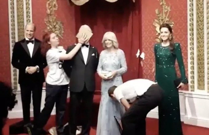Δυο νεαροί μπήκαν στο μουσείο της Μαντάμ Τισό στο Λονδίνο και έφτασαν μπροστά στα νέα κέρινα ομοιώματα των Καρόλου, Καμίλλας, Ουίλιαμ και Κέητ – δηλαδή του βασιλικού ζεύγους και του διαδόχου του θρόνου.