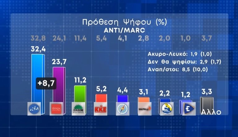 Προβάδισμα 8,7 μονάδων δίνει στη Νέα Δημοκρατία έναντι του ΣΥΡΙΖΑ η νέα δημοσκόπηση της εταιρείας MARC που παρουσιάστηκε απόψε στο Κεντρικό Δελτίο Ειδήσεων του ΑΝΤ1. Στην πρόθεση ψήφου η ΝΔ συγκεντρώνει 32,4%, ο ΣΥΡΙΖΑ 23,7%, το ΠΑΣΟΚ 11,2%, το ΚΚΕ 5,2%, η Ελληνική Λύση 4,4% και το ΜέΡΑ 25 3,1%.