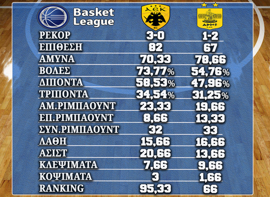 - Σουτάροντας με 54,76% (23/42), ο Άρης έχει το χαμηλότερο ποσοστό ευστοχίας στις βολές. Παράλληλα είναι η ομάδα με τα περισσότερα λάθη (16,66).