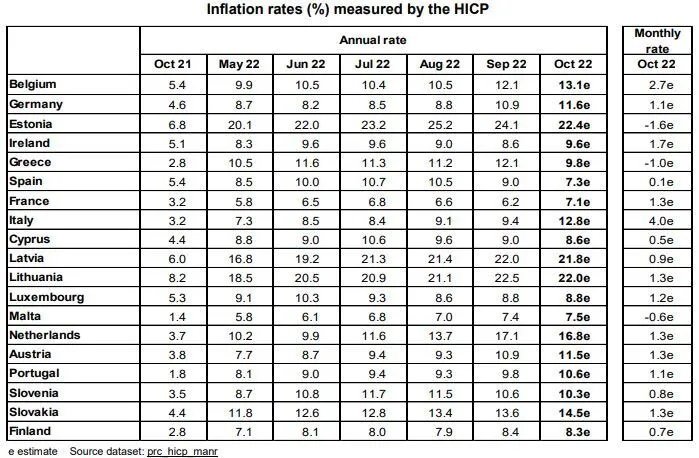 Αξίζει πάντως να σημειωθεί ότι η Ελλάδα βρίσκεται τον Οκτώβριο στο 9,8%, τη στιγμή που τον προηγούμενο μήνα ήταν στο 12,1%. Ωστόσο, τον Οκτώβριο του 2021, η Ελλάδα κατέγραφε πληθωρισμό 2,8%.