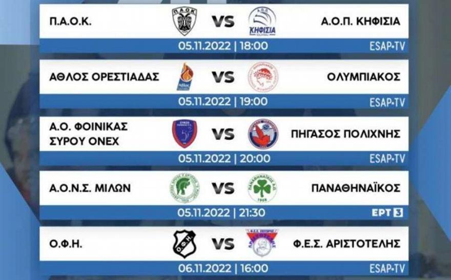 Γυμναστήριο Κροίσος Πέρσης Νέας Σμύρνης, 21:30, (Live E.Ρ.Τ.-3): Α.Ο.Ν.Σ. Μίλων - Παναθηναϊκός Α.Ο.