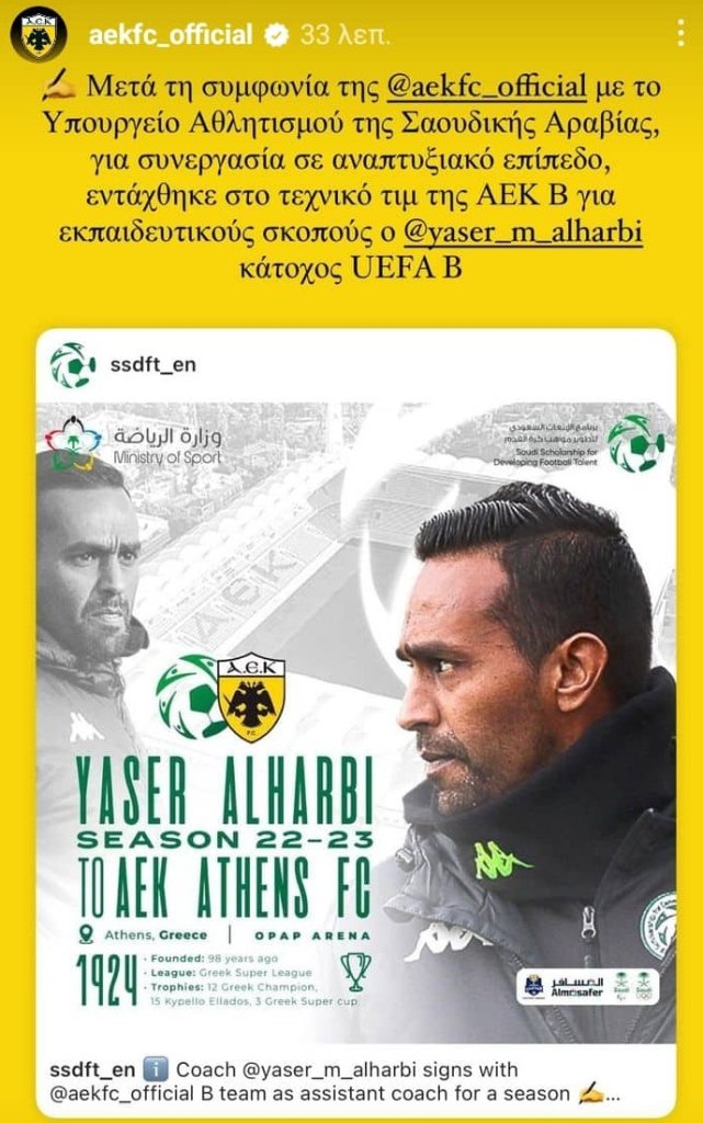 Μετά τη συμφωνία της @AEK_FC_OFFICIAL με το Υπουργείο Αθλητισμού της Σαουδικής Αραβίας, για συνεργασία σε αναπτυξιακό επίπεδο, εντάχθηκε στο τεχνικό τιμ της ΑΕΚ Β για εκπαιδευτικούς σκοπούς ο @Yaser_M_AlHarbi κάτοχος UEFA B https://t.co/9GU20cHyq2