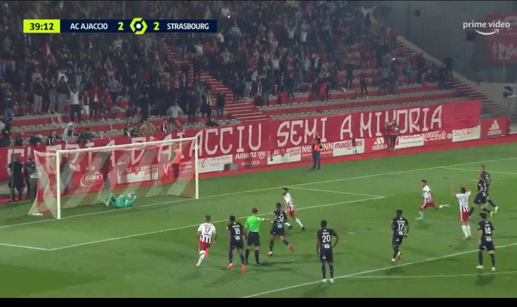 Η ομάδα από το Στρασβούργο μετρούσε τρεις αγωνιστικές χωρίς νίκη και μπήκε πολύ δυνατά στο ματς. Μόλις στο 6ο λεπτό, ο Ζαν Μπελεγκάρ, με εξαιρετική εκτέλεση φάουλ, έστειλε την μπάλα στα δίχτυα, ανοίγοντας το σκορ για τους φιλοξενούμενους. Στο 17', ο Εντζικού βρήκε τον Γκαμεϊρό, εκείνος... κρέμασε τον γκολκίπερ της Αζαξιό και διπλασίασε τα τέρματα για την ομάδα του Στρασβούργου. Η αντίδραση της Αζαξιό ήταν να βάλει τέσσερα γκολ, σε διάστημα 15 λεπτών. Στο 33', ο Γιουσέφ Μπελαϊλί αξιοποίησε το πέναλτι που δόθηκε, για χέρι, υπέρ της ομάδας του και μείωσε σε 1-2. Με τη σέντρα, σε λιγότερο από 60 δευτερόλεπτα για την ακρίβεια, οι γηπεδούχοι έκλεψαν την μπάλα, ο Χαμουμά πάσαρε στον Ελ Ιντρίσι, εκείνος, με πλάτη στο τέρμα, γύρισε, και με δυνατό σουτ ισοφάρισε σε 2-2. Στο 40ο λεπτό, η Αζαξιό κέρδισε νέο πέναλτι, ο Μπελαϊλί ήταν και πάλι εύστοχος, ολοκληρώνοντας την ανατροπή για την ομάδα του. Στις καθυστερήσεις του ημιχρόνου, ο Μπελαϊλί έκανε τη σέντρα και ο, ξεμαρκάριστος, Νούρι, με κεφαλιά, διεύρυνε το προβάδισμα της Αζαξιό, 4-2.