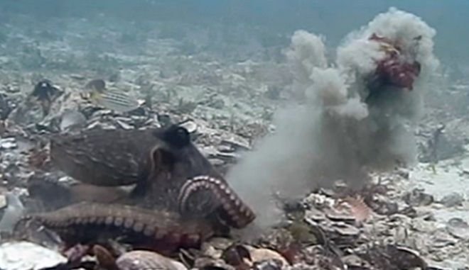 Τα γνωστά για την ευφυΐα τους κεφαλόποδα εκτόξευσαν άμμο, κομμάτια φυκιών και κοχύλια το ένα στο άλλο.