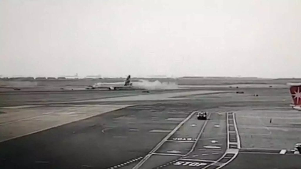 Με το σύστημα των τροχών και τη μια πτέρυγα να έχουν υποστεί ζημιά, το αεροπλάνο συνεχίζει την πορεία του με το δεξί φτερό εν μέρει να σέρνεται στο ταρμάκ, βγάζοντας φλόγες. Μόλις σταματά, αναδίδεται πυκνός μαύρος καπνός από το αεροπλάνο, που έχει πάρει φωτιά.