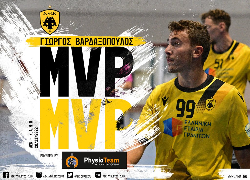 Η ομάδα χάντμπολ της ΑΕΚ επικράτησε με 39-16 της ΧΑΝΘ για την 9η αγωνιστική του Πρωταθλήματος και σε αυτο το παιχνίδι ο Γιώργος Βαρδαξόπουλος ήταν από τους κορυφαίους, με αποτέλεσμα να αναδειχθεί MVP «Physiosteo Team».