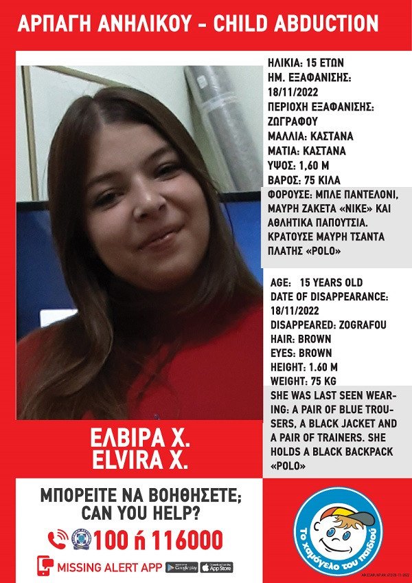 Συναγερμός έχει σημάνει στις αρχές για την αρπαγή της 15χρονης Ελβίρας Χ. από την περιοχή Ζωγράφου την περασμένη Παρασκευή (18/11) από ενήλικο άνδρα.