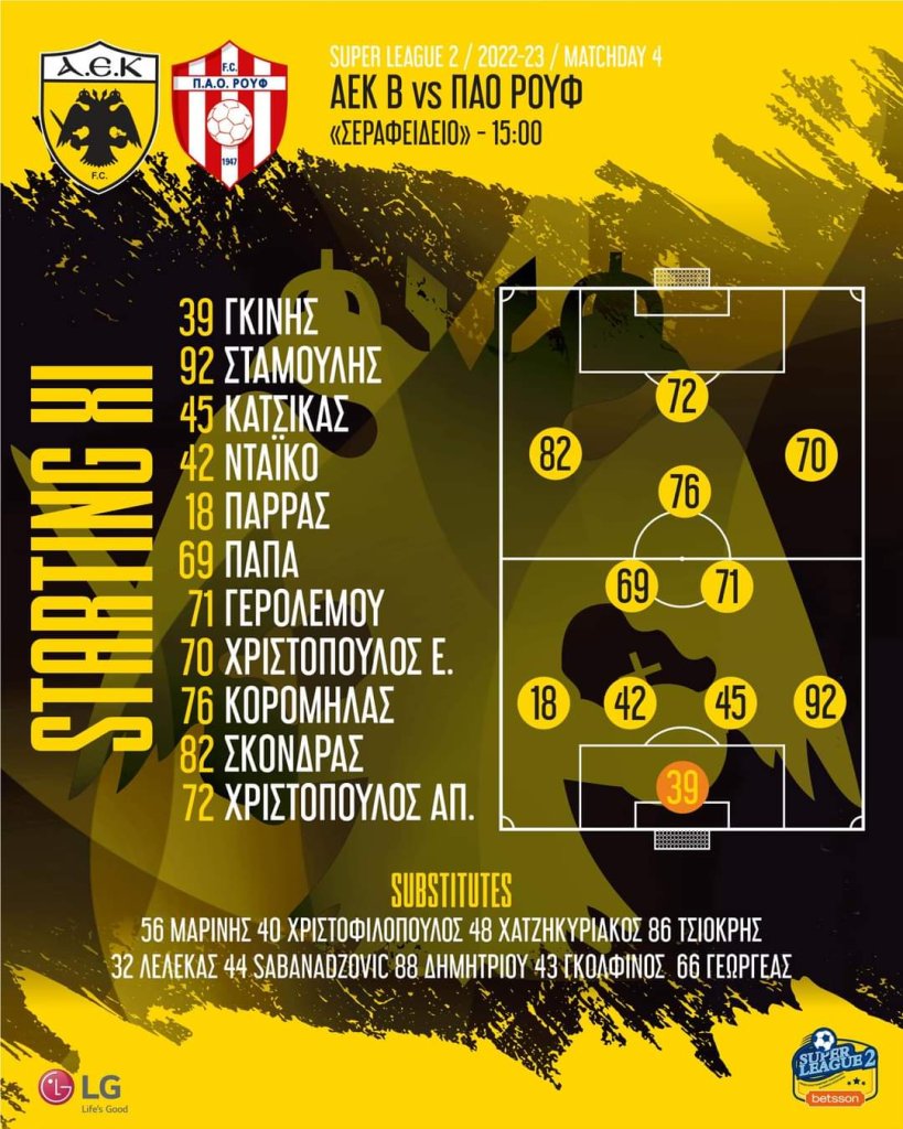 Γνωστή έγινε η ενδεκάδα της ΑΕΚ Β' για την εντός έδρας αναμέτρηση με τον ΠΑΟ Ρουφ.