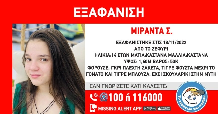 Το «Χαμόγελο του Παιδιού» σήμερα, 26/11/2022 προχώρησε στη δημοσιοποίηση των στοιχείων της ανήλικης κατόπιν εισαγγελικής εντολής, καθώς συντρέχουν λόγοι που θέτουν τη ζωή της σε κίνδυνο.