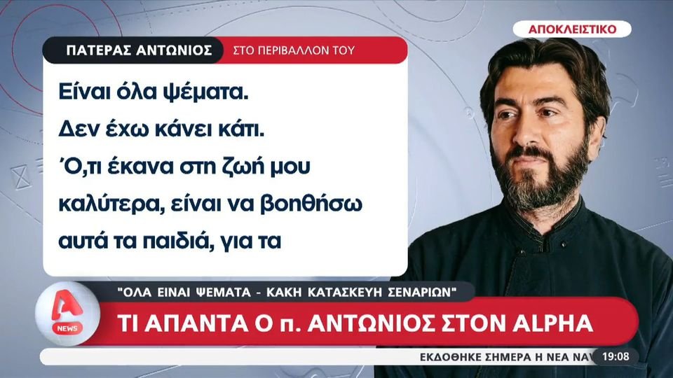 Σύμφωνα με ρεπορτάζ του Alpha, ο πατέρας Αντώνιος τοποθετείται ξανά μέσω του στενού του περιβάλλοντος, εμμένοντας στη θέση πως «όλα είναι ψέματα», αναφερόμενος στη «βροχή» καταγγελιών που έχουν δει το φως της δημοσιότητας, ενώ χρησιμοποιεί και τη φράση «κακή κατασκευή σεναρίων».