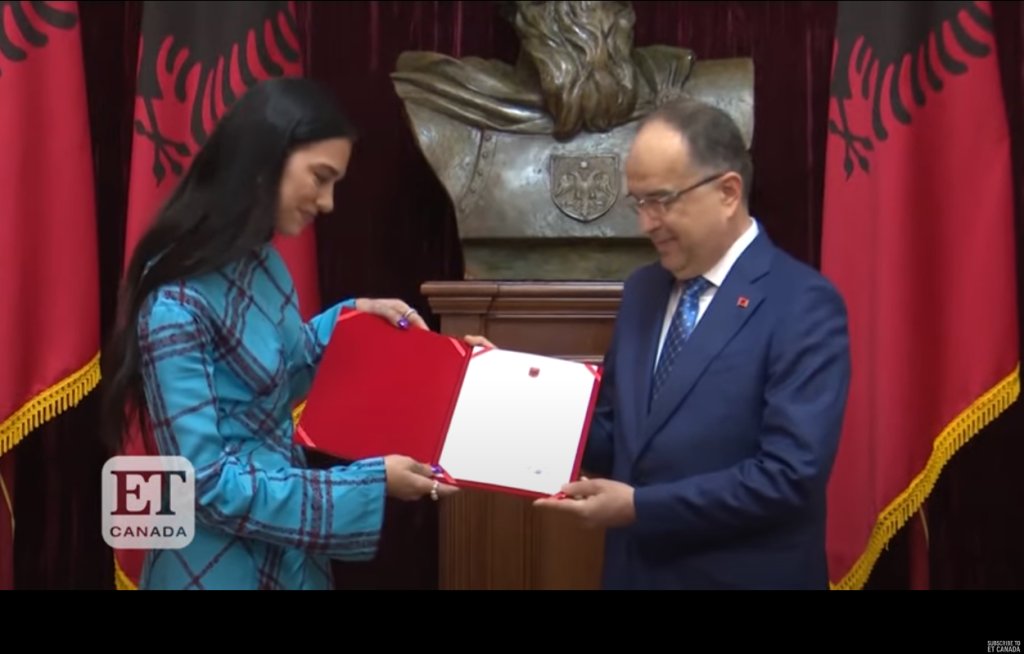 Την αλβανική υπηκοότητα χορήγησε χθες και επίσημα στην αλβανικής καταγωγής βρετανίδα ποπ σταρ Dua Lipa ο πρόεδρος της Αλβανίας Μπαϊράμ Μπεγκάι τιμώντας την για τον ρόλο της στη διάδοση της φήμης των Αλβανών διεθνώς μέσω της μουσικής της.