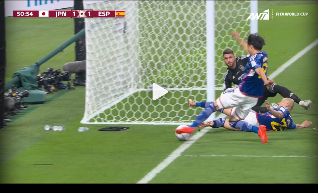 Στο 51ο λεπτό, η Ιαπωνία έφερε τούμπα το ματς, κάνοντας το 2-1, απέναντι στην Ισπανία, σε μια φάση όπου η τεχνολογία "μίλησε" και το VAR αποφάσισε πως η μπάλα δεν είχε περάσει, ολόκληρη, τη γραμμή του άουτ.
