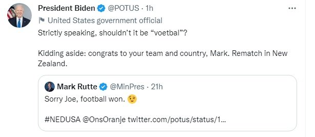 Η Ολλανδία απέκλεισε τις ΗΠΑ στη φάση των «16» του Μουντιάλ και ο πρωθυπουργός της χώρας έστειλε μήνυμα στον Τζο Μπάιντεν. «Συγγνώμη Τζο το football κέρδισε» έγραψε ο Ολλανδός αστειευόμενος με το γεγονός ότι οι Αμερικάνοι αποκαλούν το άθλημα soccer. Ο Μπάιντεν απάντησε: «Μιλώντας κυριολεκτικά δεν θα έπρεπε να είναι voetball; Πέρα από την πλάκα συγχαρητήρια στην ομάδα και τη χώρα σου».