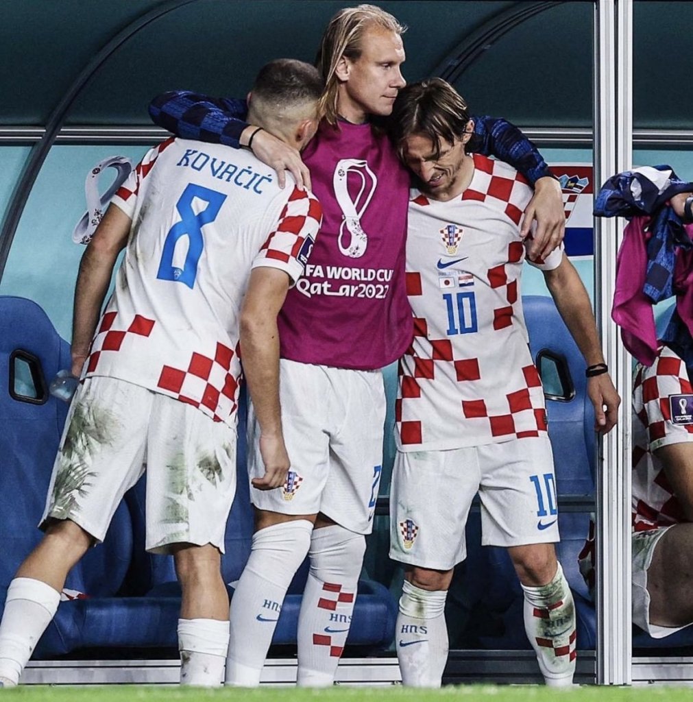 Μόντριτς και Κόβατσιτς βγήκαν κατάκοποι στο 99’ κατά τη διάρκεια της παράτασης του αγώνα της Κροατίας με την Ιαπωνία. Ο Ντομαγκόι Βίντα τους υποδέχθηκε στον πάγκο και τους αγκάλιασε. Ο αμυντικός της ΑΕΚ δεν έχει αγωνιστεί ως τώρα αλλά η παρουσία του στην Κροατία είναι ιδιαίτερα σημαντική για την ομάδα.