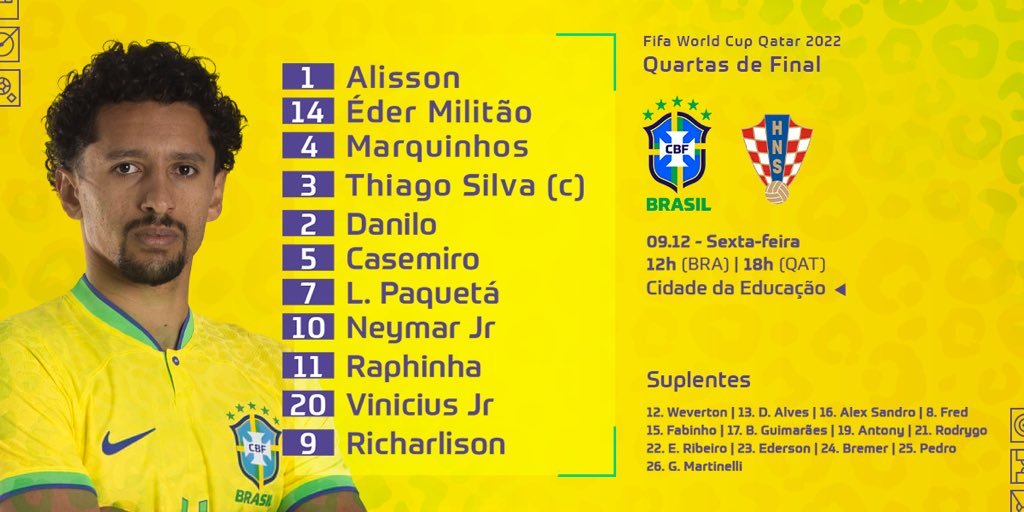 ΒΡΑΖΙΛΙΑ (Τίτε): Άλισον, Μιλιτάο, Μαρκίνιος, Τιάγκο Σίλβα, Ντανίλο, Κασεμίρο, Πακετά, Βινίσιους, Νεϊμάρ, Ραφίνια, Ριτσάρλισον