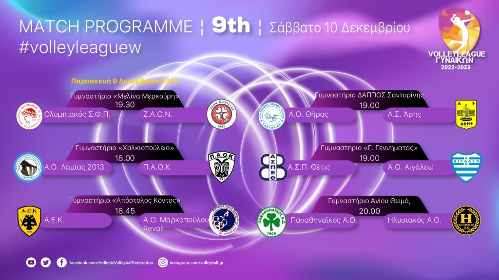 Υπενθυμίζουμε ότι η αυλαία της 9ης αγωνιστικής ανοίγει σήμερα το βράδυ με την αναμέτρηση Ολυμπιακός-ΖΑΟΝ, ενώ οι υπόλοιποι πέντε αγώνες διεξάγονται αύριο Σάββατο 10 Δεκεμβρίου.