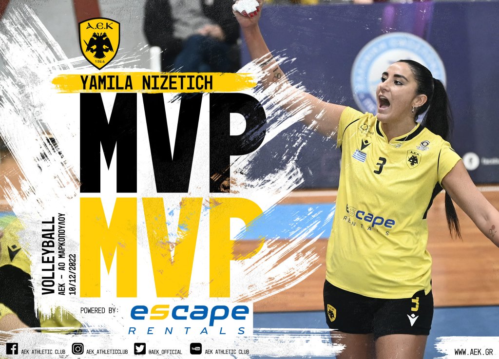 Η Γιαμίλα Νίζετιτς ήταν ασταμάτητη στο παιχνίδι της γυναικείας ομάδας βόλεϊ, στο οποίο η ΑΕΚ νίκησε στο τάι μπρέικ με 3-2 το Μαρκόπουλο για την 9η αγωνιστική της Volleyleague. Η αθλήτρια της ΑΕΚ σημείωσε 20 πόντους (18/43 επ., 1 άσσος, 1 μπλοκ, 78% υπ.-33% άριστες) και μετά το τέλος της αναμέτρησης αναδείχθηκε MVP «Escape Car Rentals».