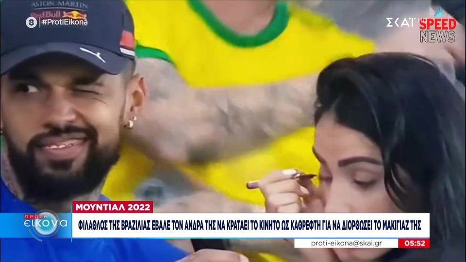 Μουντιάλ 2022: Φίλαθλος της Βραζιλίας έβαλε τον άνδρα της να κρατάει το κινητό ως καθρέφτη για να διορθώσει το μακιγιάζ της (VIDEO)