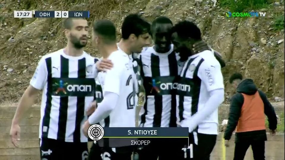 Ο ΟΦΗ ξεκίνησε ιδανικά το παιχνίδι σκοράροντας στο 4’ με την προβολή του Ντίκο μετά από την εξαιρετική ασίστ του Μπαλογιάννη. Στο 18’ ο Ντιουσέ έκανε το 2-0 με ένα φανταστικό γκολ εκτός περιοχής, ενώ στο 40’ ο Λάρσον πέτυχε το τρίτο γκολ του ΟΦΗ μετά από τον πολύ ωραίο συνδυασμό των Μπαλογιάννη, Τοράλ και Ντίκο. Ο ΟΦΗ ήταν απειλητικός σε όλο το ματς, έβγαζε πολύ καλές συνεργασίες και δεν άφησε τον Ιωνικό να κάνει το παιχνίδι του.