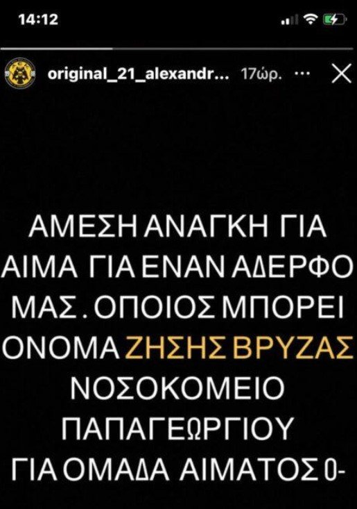 Με σχετική ανάρτηση με «story» στα μέσα κοινωνικής δικτύωσης, ο σύνδεσμος της Original 21 στην Αλεξανδρούπολη, απευθύνει ένα κάλεσμα σε όποιον μπορεί να βοηθήσει. Κι αυτό διότι υπάρχει άμεση ανάγκη για αίμα, στο όνομα Ζήσης Βρύζας, που νοσηλεύεται στο νοσοκομείο Παπαγεωργίου, ενώ η ομάδα αίματός του, είναι 0 αρνητικό.