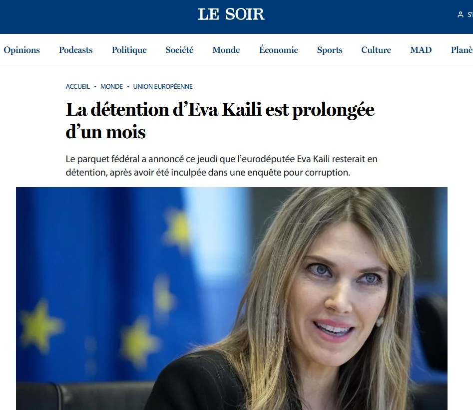 «Παρατείνεται για έναν μήνα η κράτηση της Εύας Καϊλή. Η Ομοσπονδιακή Εισαγγελία ανακοίνωσε την Πέμπτη ότι η ευρωβουλευτής Εύα Καϊλή θα παραμείνει υπό κράτηση αφού κατηγορήθηκε για έρευνα για διαφθορά», έγραψε η βελγική Le Soir.