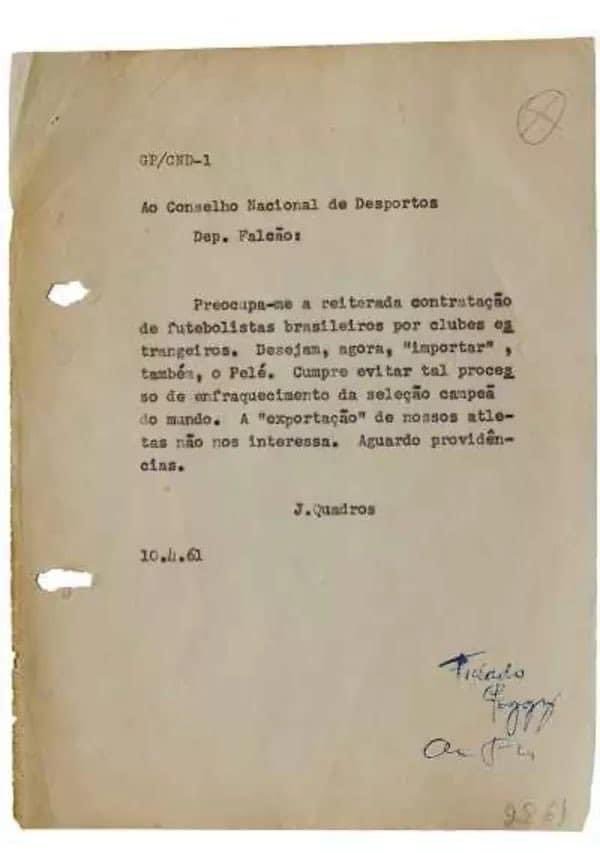 «Προβληματίζομαι για την επαναλαμβανόμενη πρόσληψη Βραζιλιάνων ποδοσφαιριστών από ξένους συλλόγους. Τώρα θέλουν να πάρουν και τον Πελέ. Η εξαγωγή αθλητών δεν μας ενδιαφέρει. Περιμένω μέτρα» ανέφερε το ξεκάθαρο μήνυμά του που εστάλη τον Απρίλιο του 1961.
